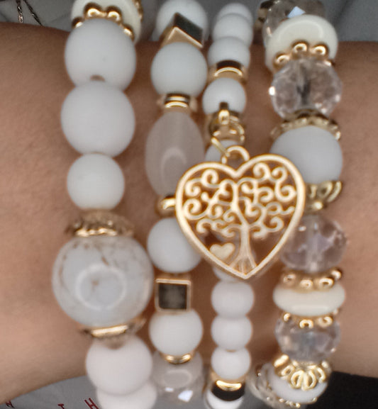 Four Piece Pearl Bracelets White and Gold with tree of life symbol